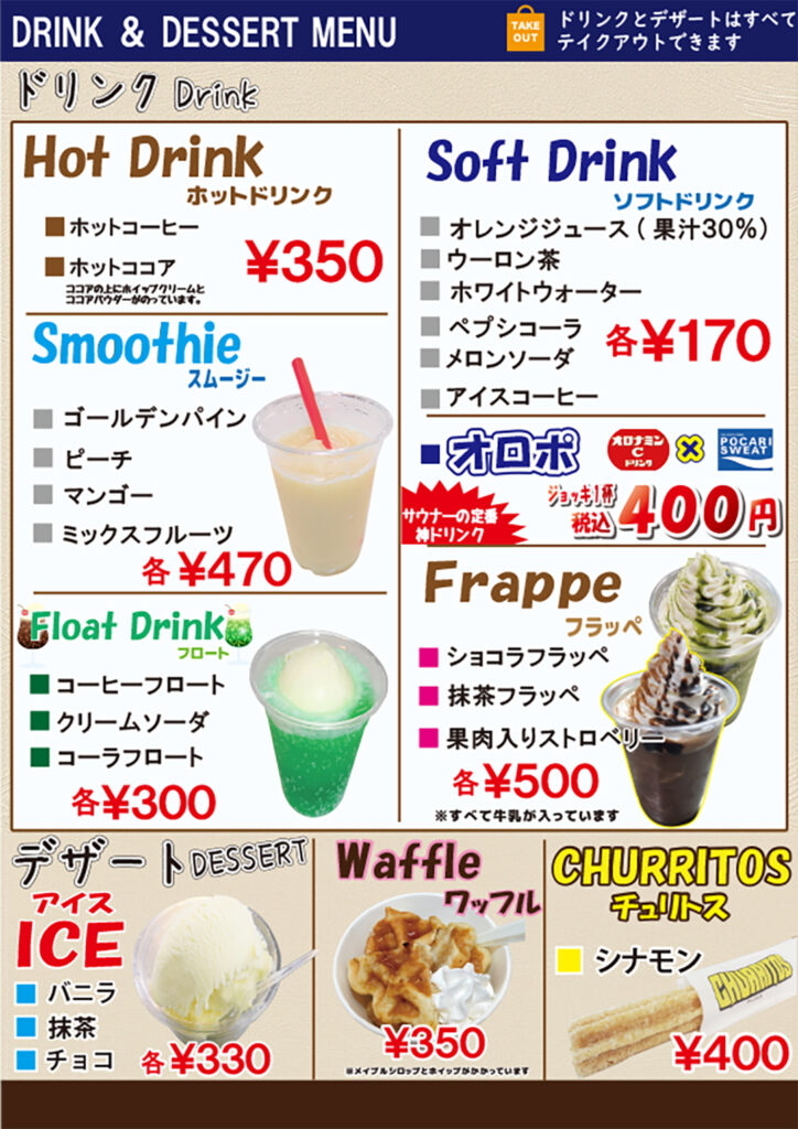 テイクアウトもできるドリンク片手に、お好きな湯上り処でcafe timeを楽しむのもお勧めです。