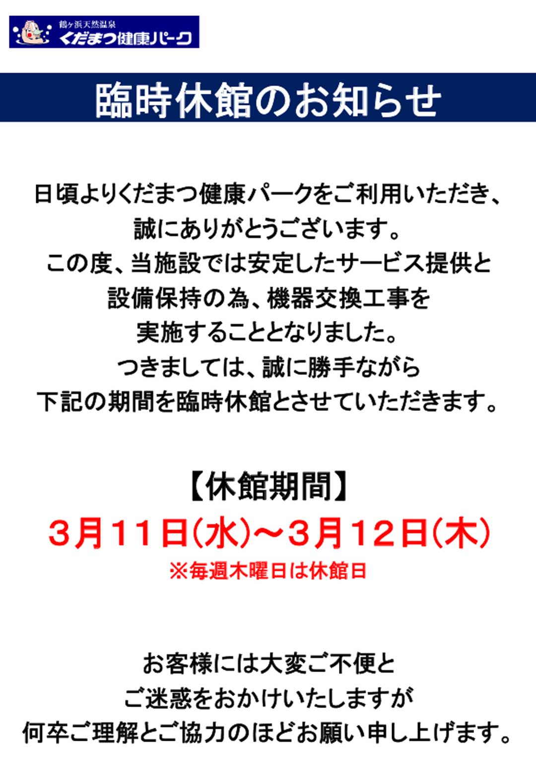 健康パーク臨時休館の為、3月11日(水)グランドシニアはお風呂がご利用できません。